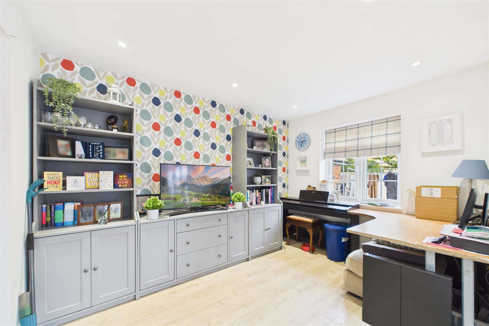 Outside, the enclosed rear garden is mainly laid to lawn with a paved patio area—perfect for outdoor dining—and also features a garden office, ideal for home working. To the front, there is off-road parking for two vehicles and a 19'8" garage providing excellent storage or workshop potential.